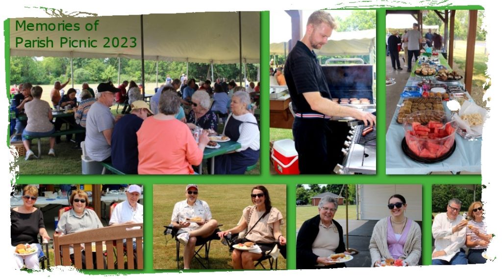 Fr. Matt invites you all to a potluck parish picnic in our pavilion and on the surrounding field on Sunday, May 31, 2026, after the 11:00 AM Mass. He will be grilling burgers and dogs. For seating, please bring a blanket or a lawn chair. If your last name ends in A-H, please bring a side dish to share. If your last name ends in I-P, please bring beverages. To round out the alphabet, those with last names Q-Z are asked to bring a dessert. Enjoy this time to relax, dine, and share life with each other on our picturesque grounds.