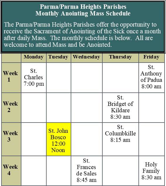 On Tuesday, April 21, 2026, the Anointing of the Sick will take place at St. John Bosco after the 7:30 AM Mass.