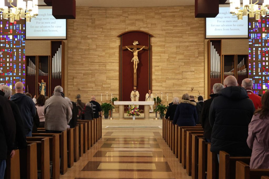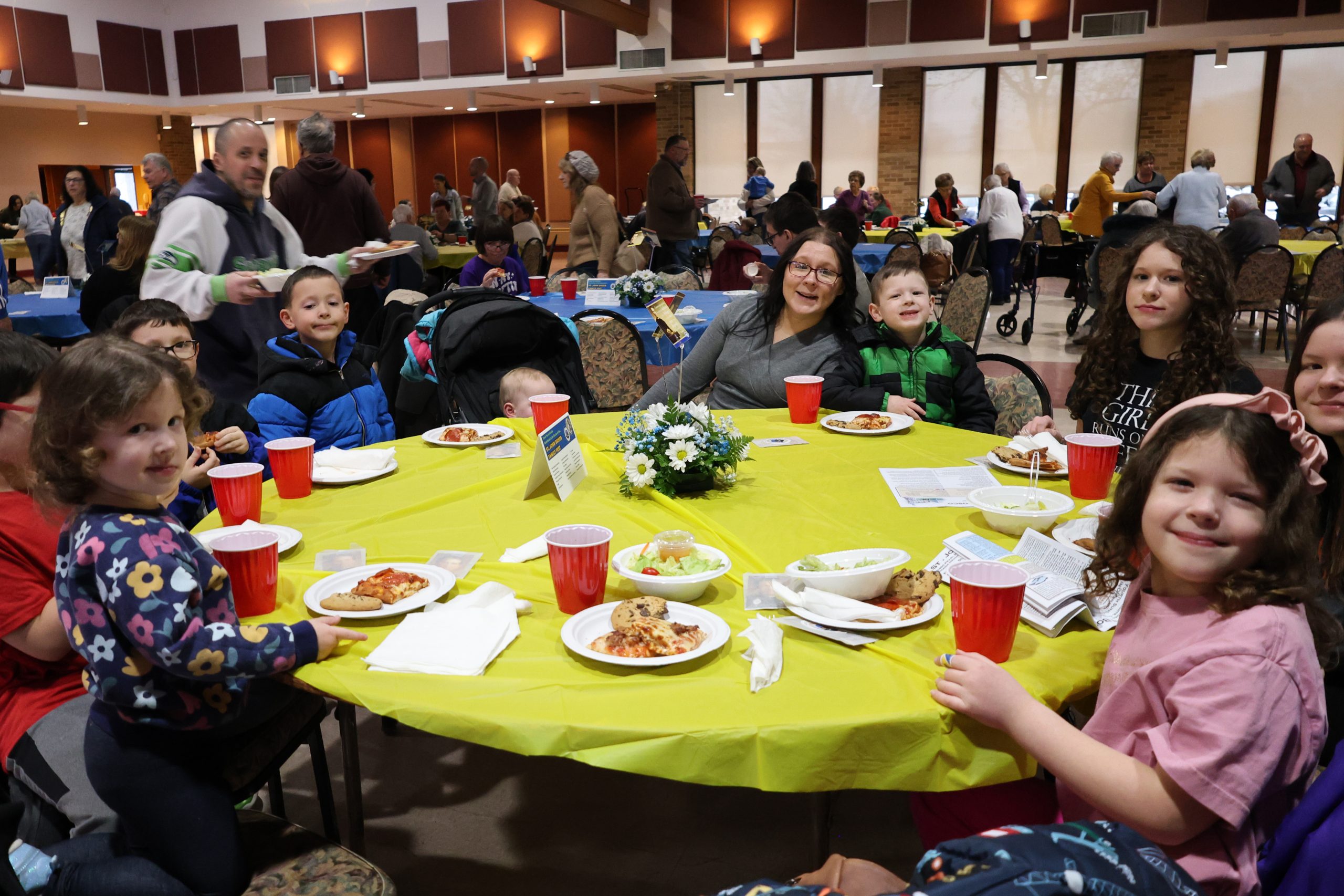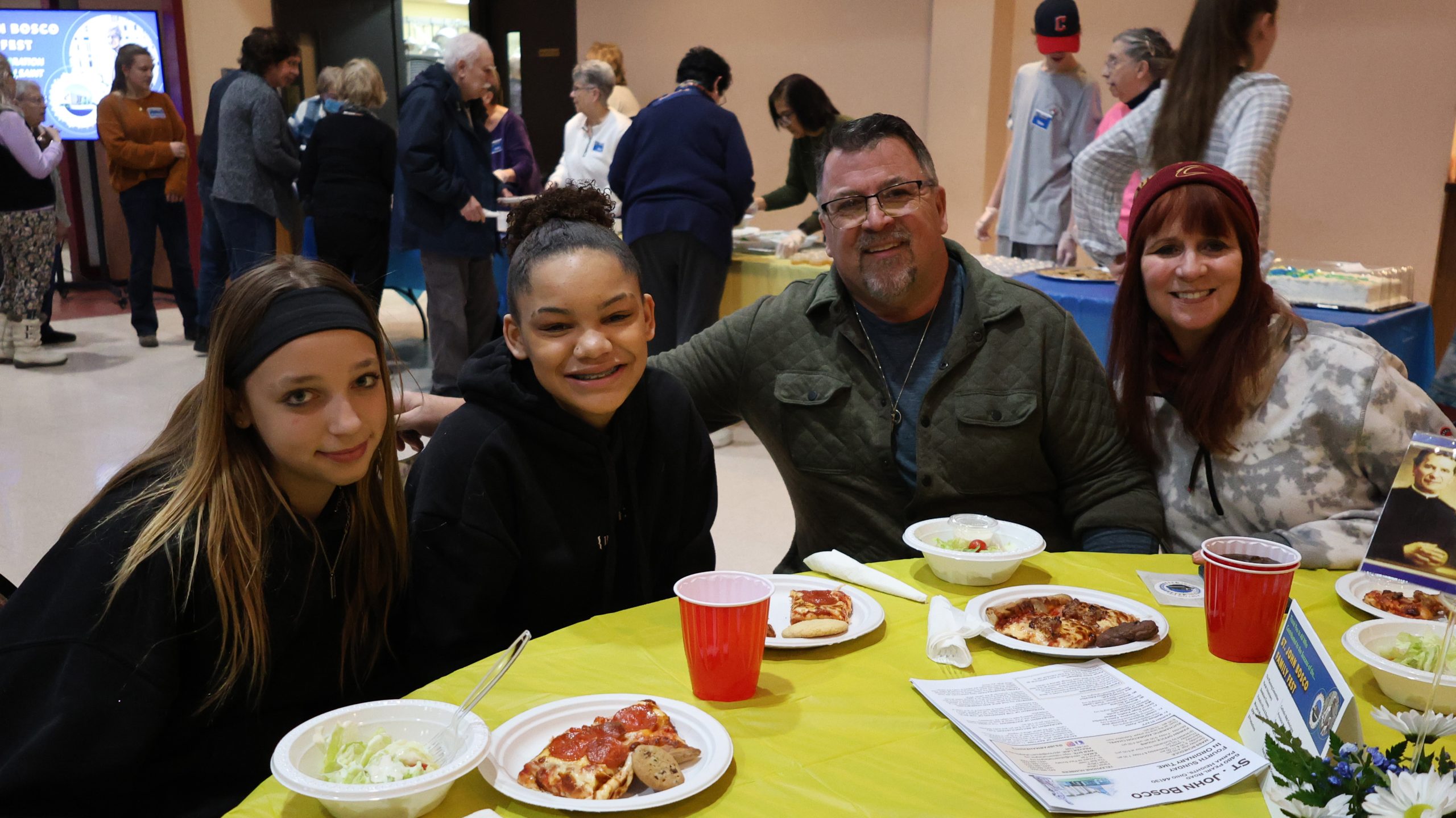 While people finished eating, they watched a video about St. John Bosco on four large monitors placed throughout the area so everyone could see.