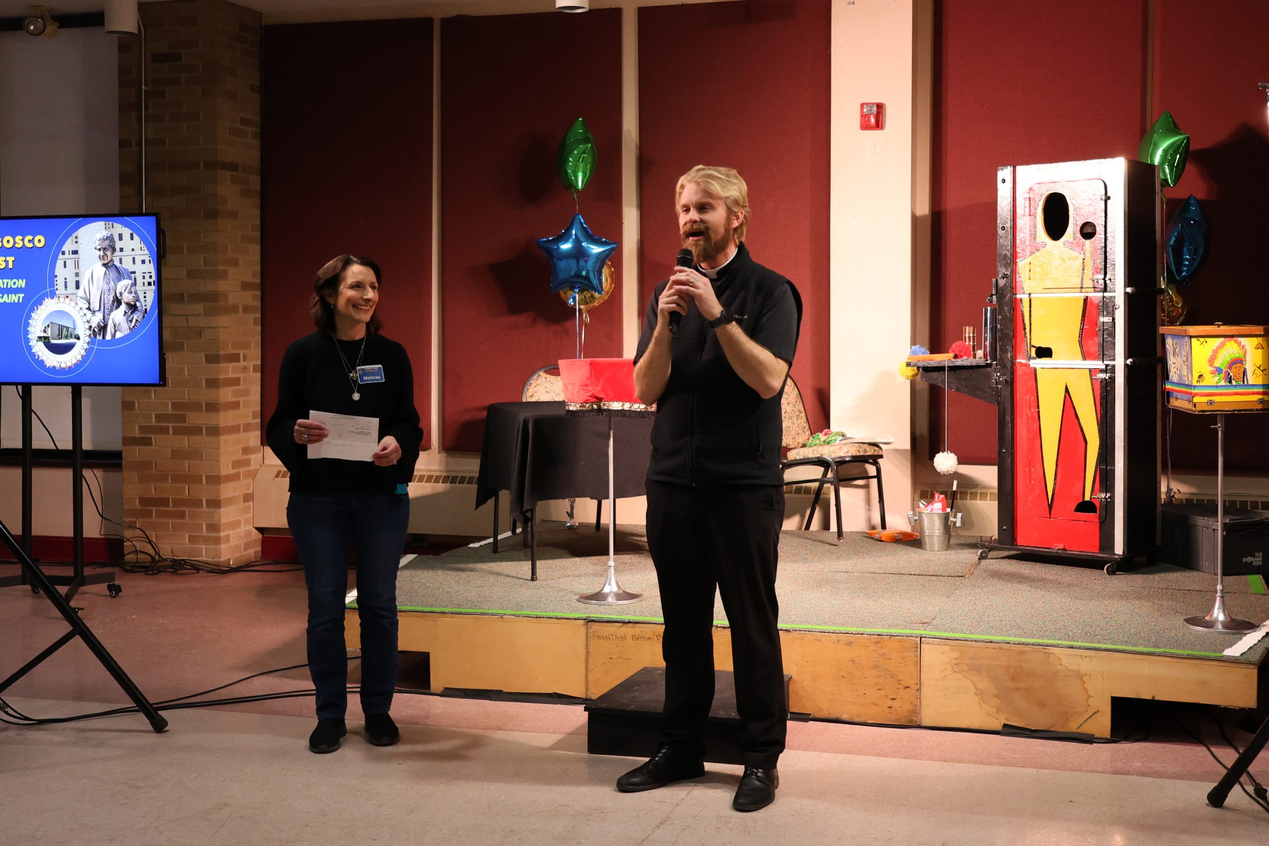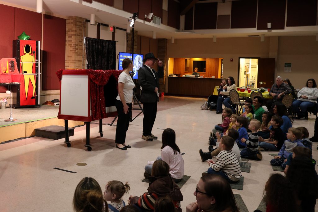 On Saturday, January 31,the Feast of St. John Bosco, more than 280 parishioners enjoyed an evening of fun, inspiration, and entertainment in honor of our parish patron saint. After the 4 PM Mass, they gathered in the Bell Tower for pizza, salad, and cookies. At each seat, they found a small gift envelope containing a laminated holy card of St. John Bosco and a Miraculous Medal. Melissa Barber-Tarolla, Director of Discipleship, served as the event’s leader, coordinator, and Master of Ceremonies, welcoming everyone. Pastor Father Matt Byrne offered a blessing for the meal and delivered opening remarks, emphasizing how much we can learn from St. John Bosco.